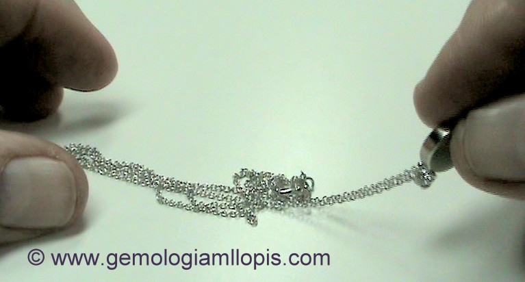 Todo empezó porque un cliente vino a nuestro laboratorio recomendado por uno de los dos joyeros que había visitado para intentar averiguar el valor de una cadena rolo, aparentemente de oro blanco con un cierre de resorte y una montura de cuatro garras de hilo redondo con un aparentemente diamante de talla brillante. La intención del cliente, según comenta, era de averiguar el coste de la pieza que le habían regalado a su hija, para corresponder en similar cuantía a la persona que se la regaló. La sorpresa fue que en las dos joyerías le dijeron que no era oro y que posiblemente, al no ser la cadena de oro, la piedra engastada en la montura de cuatro garras tampoco sería un diamante. Ante tal tesitura el cliente llegó a pensar que a la persona que le había regalado la pieza a su hija, la habían estafado. Le pregunté que porque le habían dicho que no era oro, y me contestó que porque le habían pasado un imán y la a traía con mucha fuerza.