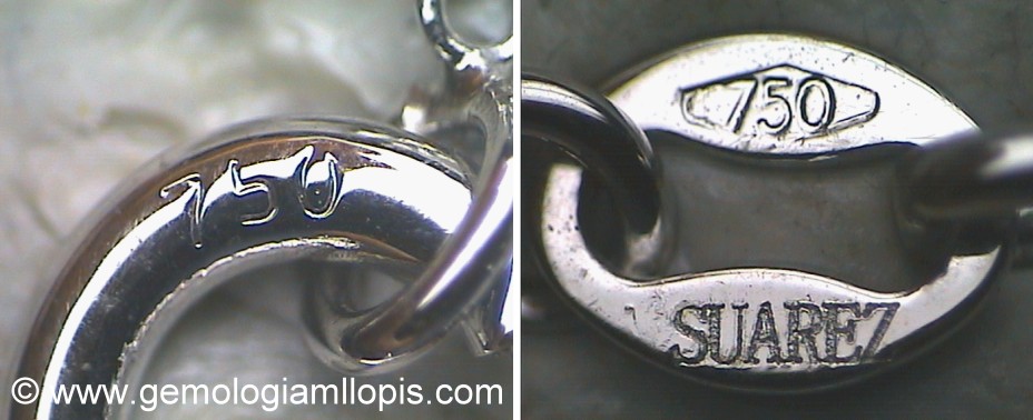 Una vez la pieza en nuestro laboratorio, la observamos con detenimiento. Se trata de una cadena llamada comercialmente «rolo», de diminutos anillos de hilo fino de media caña articulados, con cierre de resorte y en la mitad de la cadena, soldada, lleva una montura de cuatro garras de hilo redondo con una piedra incolora de talla brillante engastada. Observo la cadena y veo al lado del resorte, el primer eslabón que es una anilla mas grande, oval y aplanada en la que consta un rombo con los números 750 y un grabado con láser «SUAREZ» (se nota por los micropuntos). Observo con una lupa 10x la piedra incolora y veo que se trata de un diamante. Aristas vivas, buenas proporciones, pocas inclusiones, filetín facetado y, ¡¡ahhhh!!, además lleva una inscripción en el filetín realizada con láser donde se aprecia GIA  2146417134. Consulto la web de GIA y compruebo que el diamante es de 0,23 ct. color H pureza SI1 (E, VG, Ex) tal y como dice el certificado y coincide con sus medidas. A continuación pruebo la cadena con la piedra de toque y el ácido 18K y veo que se borra, le paso un pequeño, pero potente imán tipo «pila botón» y se adhiere con mucha fuerza en cualquier parte de la cadena, también en el resorte  y el colgante. Empiezo a pensar, …,  y lo primero que me llama la atención es, «una firma tan importante ¿va a manchar su nombre con esta pieza sencilla?»porque a pesar de ser solo una cadena de 3 gramos y un diamante de tan solo 0,23 ct. la pieza está plagada de detalles, marca de fabricante y punzones de ley de metal (750/000) en la cadena y en el resorte e inscripción láser en filetín del diamante. Eso no lo hace casi nadie, he visto piezas mas complejas y de mas importancia casi sin punzones o marcas de identificación, incluso sin ninguno.