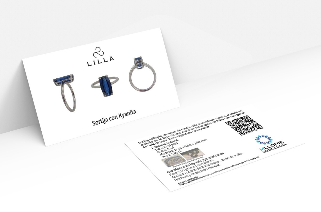 Todas sus piezas se entregan con un certificado de calidad en el que figuran los datos gemológicos de la piedra, su naturaleza, medidas, talla, los datos del tipo y ley de metal, y los punzones de ley de metal y de logo del fabricante LILLA. Estos datos figuran en una tarjeta plástica del tipo tarjeta de crédito, avalados por MLLOPIS. También se puede ver un código QR que lleva al certificado original online de MLLOPIS.