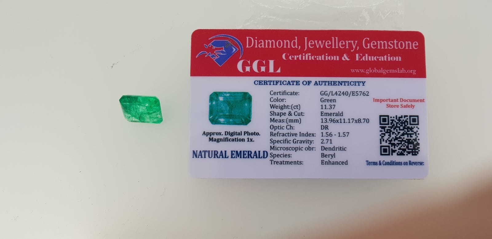El certificado es de un laboratorio CGL pero no se de que ciudad, en este enlace menciona todas sus sucursales http://www.cgl-labs.com/contact-us. He comprobado el código QR y no coincide con ningún ejemplar certificado por este laboratorio. Eso me indica que posiblemente , alguien se dedique a hacer copias falsas del certificado, con fotos reales de la pieza que entregan, pero de la que no coincide ningún dato gemológico. Ni el peso, ni las medidas, ni el material y variedad. En este caso concreto se trata de un cuarzo cristal de roca, la variedad fanerocristalina incolora del cuarzo, que una vez craquelado, es decir le han provocado fisuras, es teñido, de tal manera que el colorante se mete a través de las fisuras provocadas y es el tinte el que le da color a la piedra.