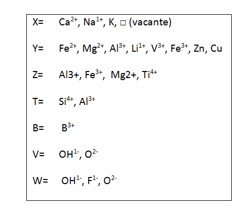 La fórmula general es (X)(Y3)(Z6)[T6O18](BO3)V3W donde: