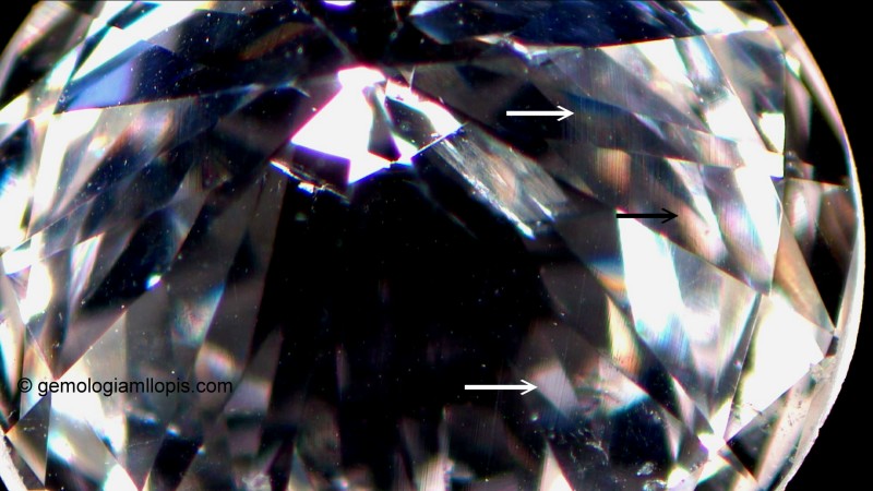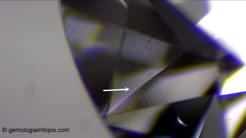 Rayas de pulido en un diamante. Podrían confundirse con línes de grano, pero debemos fijarnos que en cada faceta cambian de dirección. Las líneas de grano, como muestra la imagen anterior, siguen la misma dirección en toda su longitud. Luz reflejada, 25X.