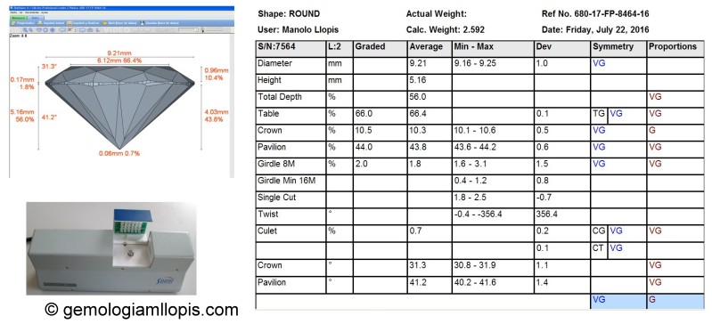 Instrumento para evaluar las proporciones y simetría de las tallas de los diamantes y las gráficas que proporciona