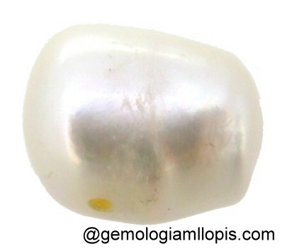 Cabe destacar que entre las perlas de aguadulce había una con núcleo muy parecida a las perlas de los mares del sur; así, de esta manera queda descartada la procedencia de esta perla que por su apariencia podía pasar como originaría de los mares del sur. Esta es una de las consultas en el campo de las perlas que actualmente recibimos más a menudo en nuestro laboratorio: diferenciar las perlas de los mares del sur de las de agua dulce con núcleo de gran tamaño.