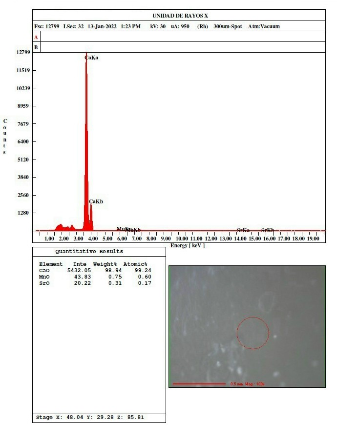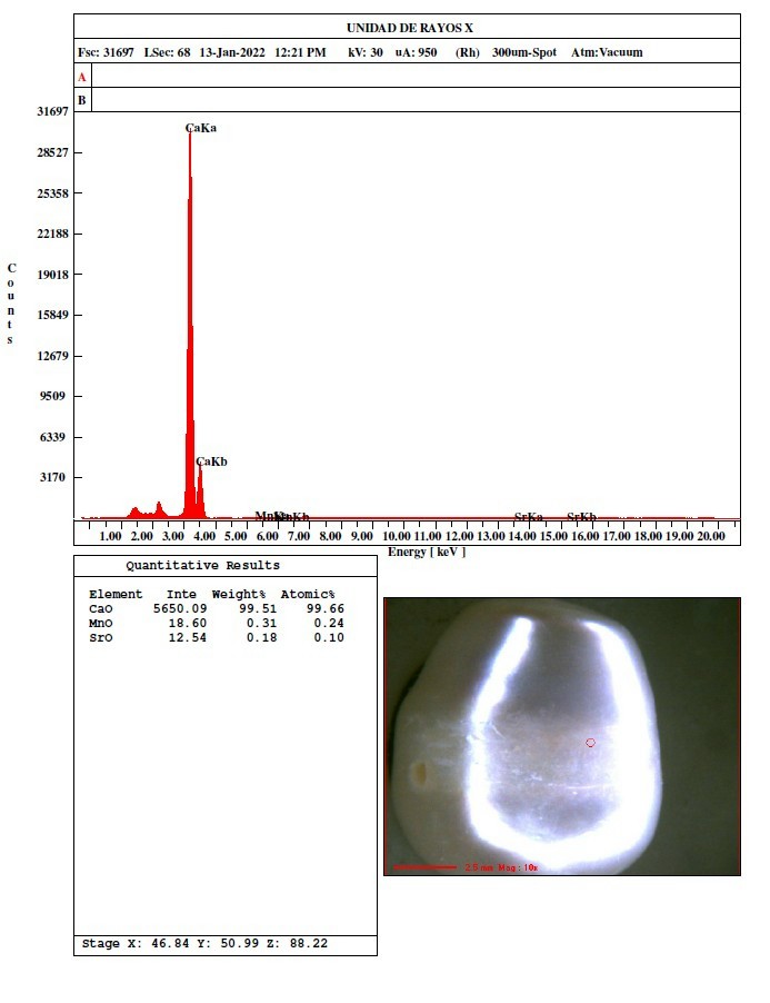 Resultado del análisis de fluorescencia de rayos X de la perla de agua dulce con núcleo de la imagen anterior. Vemos que en este caso sí se ha detectado manganeso y menos estroncio.