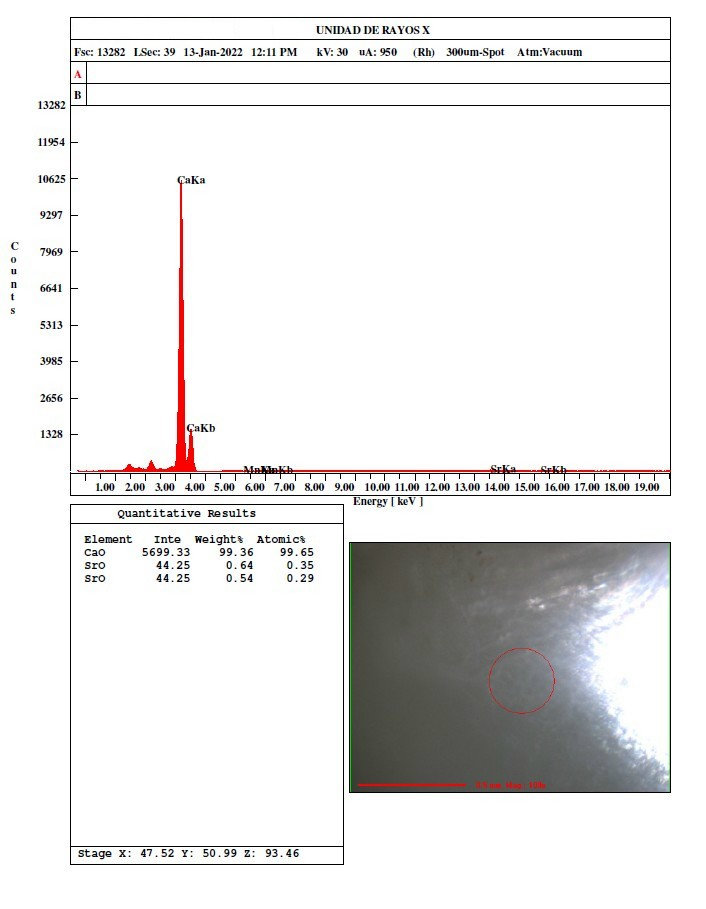 La técnica seleccionada para el ensayo fue la fluorescencia de rayos X. Esta técnica espectroscópica usa la emisión fluorescente generada al excitar una muestra con una fuente de radiación X. Es un análisis químico no destructivo, tanto cualitativo como cuantitativo, de los elementos comprendidos entre el flúor y el uranio desde concentraciones muy bajas hasta el 100% del material. La fluorescencia de rayos X por energía dispersiva (EDXRF) es otra variante de este método de análisis que se emplea muy a menudo en el análisis de perlas, pero en este caso hemos recurrido a microfluorescencia de Rayos X (µFRX) que permite el examen de zonas de las muestras muy pequeñas y localizadas.