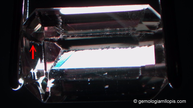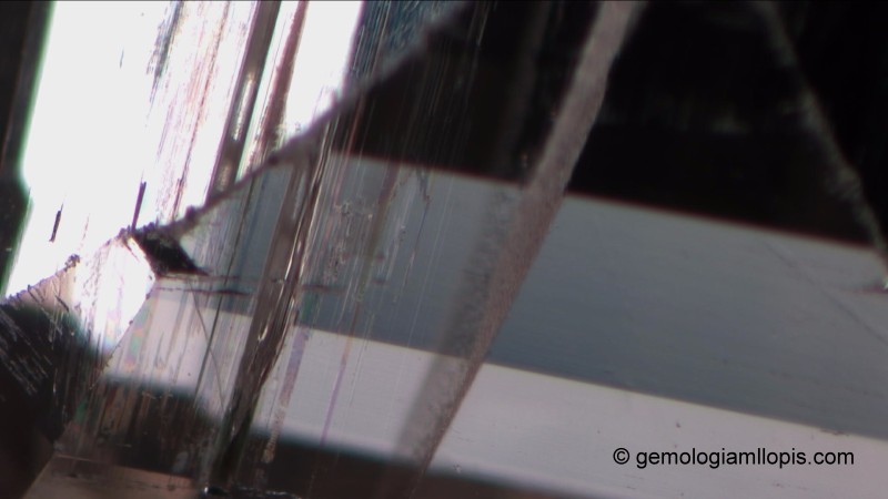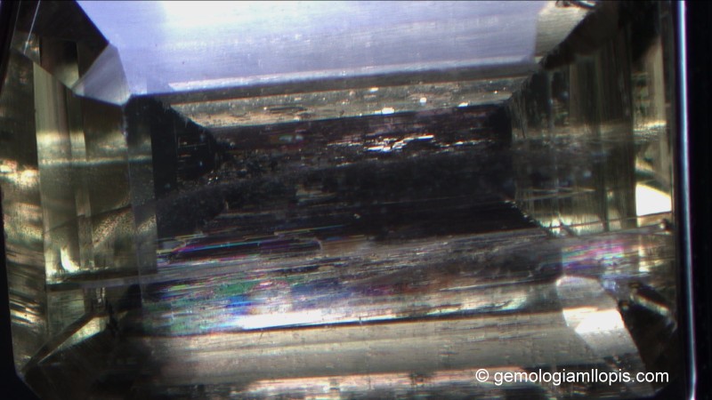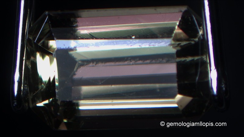 Tuvimos la oprtunidad de examinar dos ejemplares en nuestro laboratorio, unos de 3,47 ct, y otro de 2,03 ct. Ambos tallados en estilo esmeralda. En primer lugar destacaba la fuerte birrefringencia que producía el desdoblameinto de las aristas de la culata cuando observamos la gema a través de la tabla.