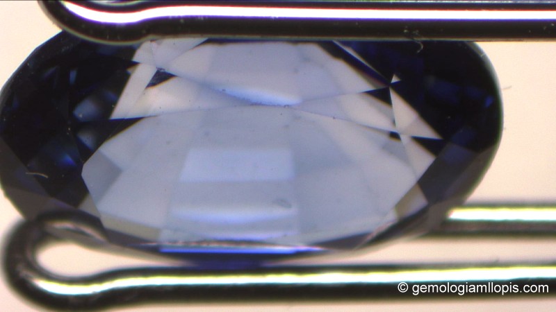 Los zafiros azules tratados por difusión suelen mostrar el color concentrado en las aristas que forman las facetas porque debido al repulido la capa de color de las facetas es muy ligera. Esta característica nos proporciona la clave para su identificación. Al situar la gema sobre un fondo blanco es posible que veamos la concentración de color, pero, en cualquier caso, sumergida en un líquido de alto índice de refracción, como por ejemplo el ioduro de metileno (1,74), y con iluminación transmitida difusa, veremos la concentración de color en las aristas claramente; si la gema está tallada en cabujón la concentración de color la veremos en el contorno de la gema y en fracturas o fisuras internas que llegan a la superficie.