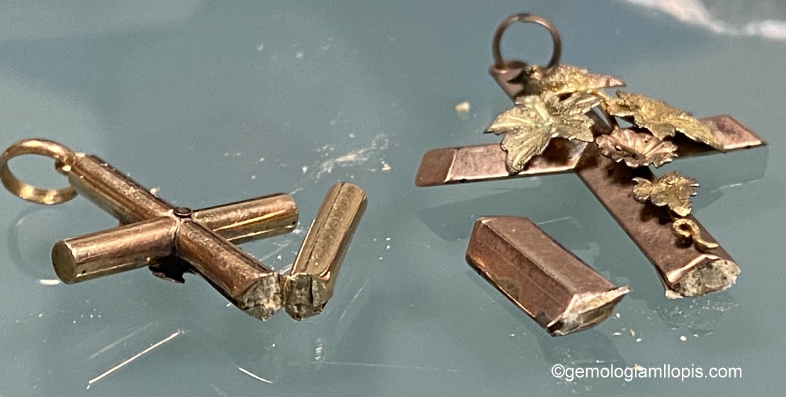 Nos ponemos en contacto con la empresa de afinaje de metales, nos dan presupuesto y una vez todos sabedores y admitiendo el presupuesto, hago la entrega de las piezas para su fundición y posterior afinaje. Cuando la empresa se pone manos a la obra, advierte algunos detalles anormales por lo que se pone en contacto conmigo para comunicármelo. Uno de ellos es una esclava de tubo redondo, articulada,  con charnela y cierre de cajón con lengua camuflado, que tiene un peso excesivo para lo que suele ser normal (58 gramos, cuando lo normal suelen ser entre 15 y 20 g.) y aspecto al tacto de ser maciza, cosa que tampoco es habitual. También   dos cruces  supuestamente huecas, pero al tacto y por el sonido del golpe al dejarlas caer en una mesa que las hace parecer macizas. Cuando visito el taller de afinaje, delante de mí, cortan y/o seccionan estas tres piezas. Mi asombro viene después cuando veo que la esclava tiene un núcleo o «alma», que llaman los joyeros, de cobre y las dos cruces están rellenas de yeso. Sencillamente ¡alucinante!.