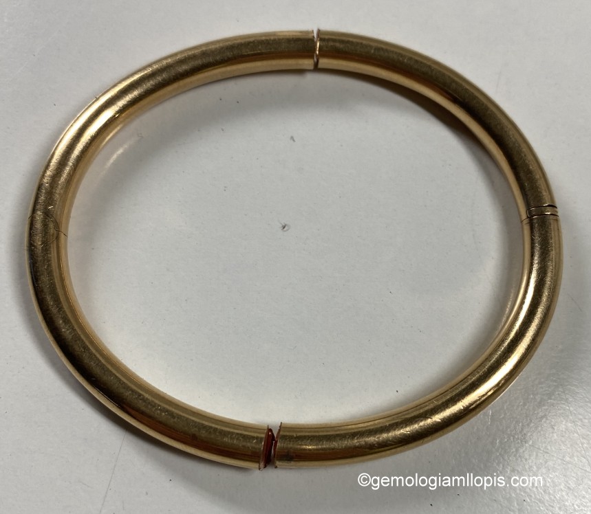 Esclava de tubo redondo de 6,50 mm. de diámetro , que normalmente son huecas, con pesos que oscilan entre los 15 a 20 gramos de oro de ley de 18 quilates. Esta pesa 58,00 gramos.