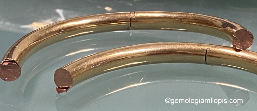 Secciones que quedan a la vista, donde se aprecia el color mas rojizo del cobre. Pieza supuestamente maciza de oro, que no lo es.