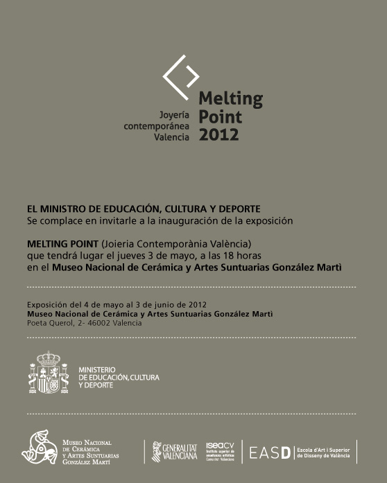 «Seria para mi un placer que pudieras asistir a la inauguración de la exposición MELTING POINT de joyería contemporánea en el Museo Nacional de Cerámica y Artes Suntuarias González Martí (Marques de dos Aguas), donde participo con una colección hecha en titanio, oro y gemas.»