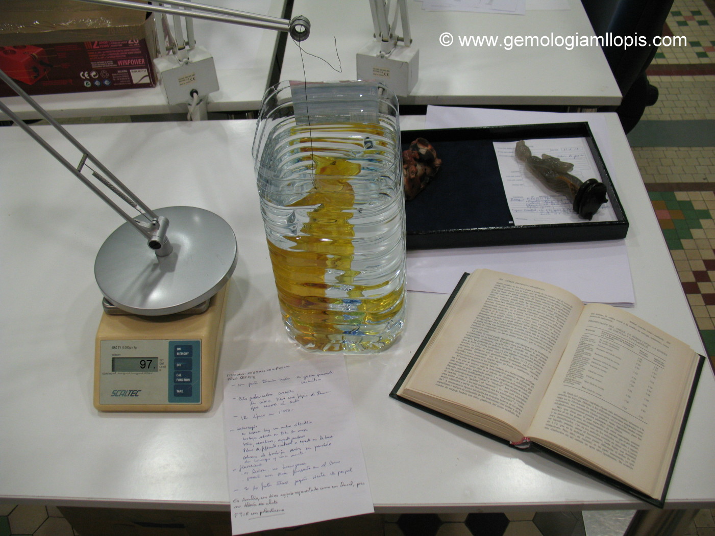 Cuando hicimos el cálculo de la densidad al pesarla en el aire y luego en el agua, su densidad es de 1,208 y esto marca mucha diferencia con el ámbar y la resina copal que tienen 1,08 y 1,06 respectivamente.