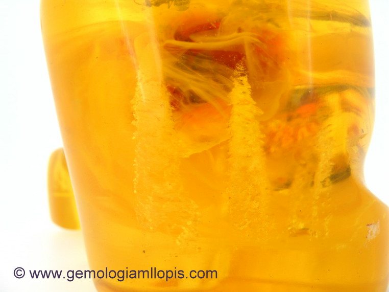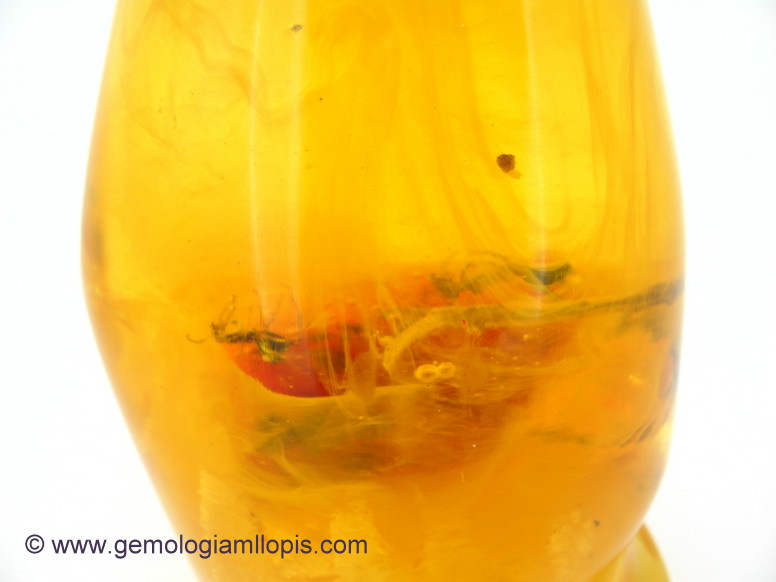 Otra de las diferencias y es muy característica es el olor a goma quemada que nunca se produce en el ámbar, cuando le pinchas con una fina aguja calentada al rojo vivo.