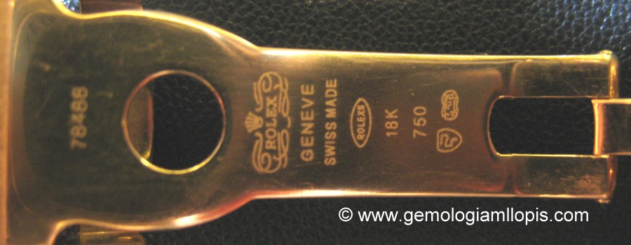 El maestro relojero cuando lo coge, exclama ¡uf,.. pesa poco!, ese detalle se me quedó, ya había comprobado con la piedra de toque que daba bien los 18 Ktes. comprobación a pesar de los muchos grabados que llevaba en el cierre 750, 18 K.  etc. . Grabados que me parecieron raros realizados con láser, cuando normalmente son de punzón, pero pensé, será la forma actual de marcarlos. No somos expertos relojeros, lo que hacemos es buscar el concesionario mas cercano para que abra el reloj y nos confirme su autenticidad, al mismo tiempo fotografiamos su máquina y todos los punzones y grabados internos y externos, demostrando así en un documento muy gráfico que la pieza es original.