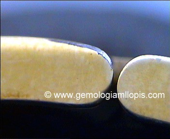 Rascadura en el borde de un eslabón visto al microscopio. Se aprecia que el color de base es blanco y es acero, en realidad se trata de una pulsera de acero con un chapado fuerte de oro.