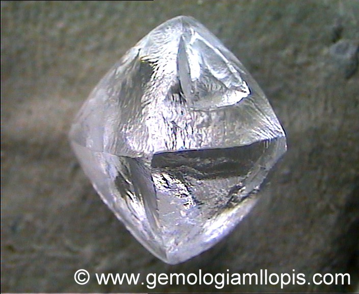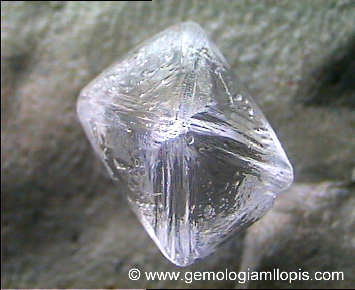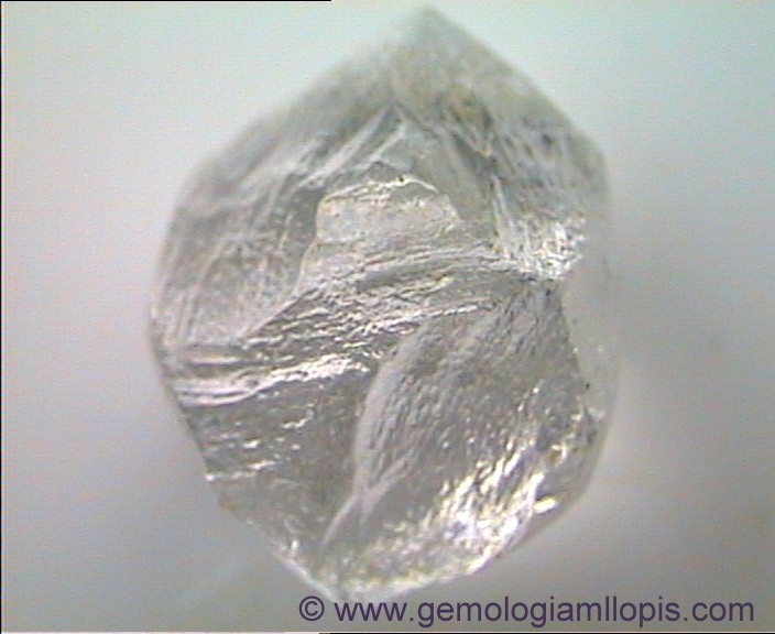 Octraedro de circonita, tallado aposta para imitar a un diamante en bruto. Se aprecian, muy bien imitadas, las estrías de crecimiento que habitualmente presenta el diamante en bruto.
