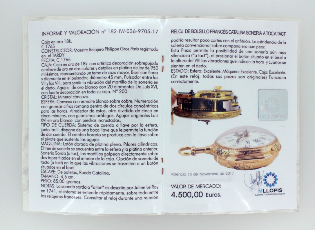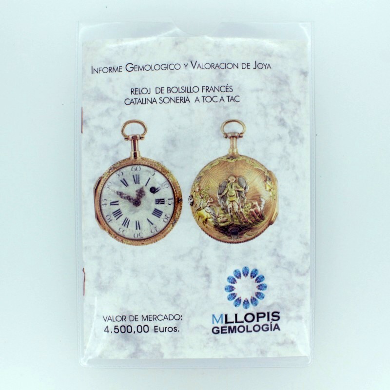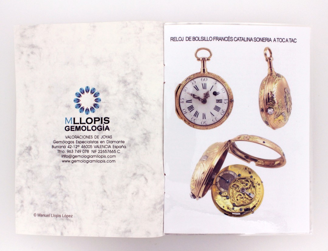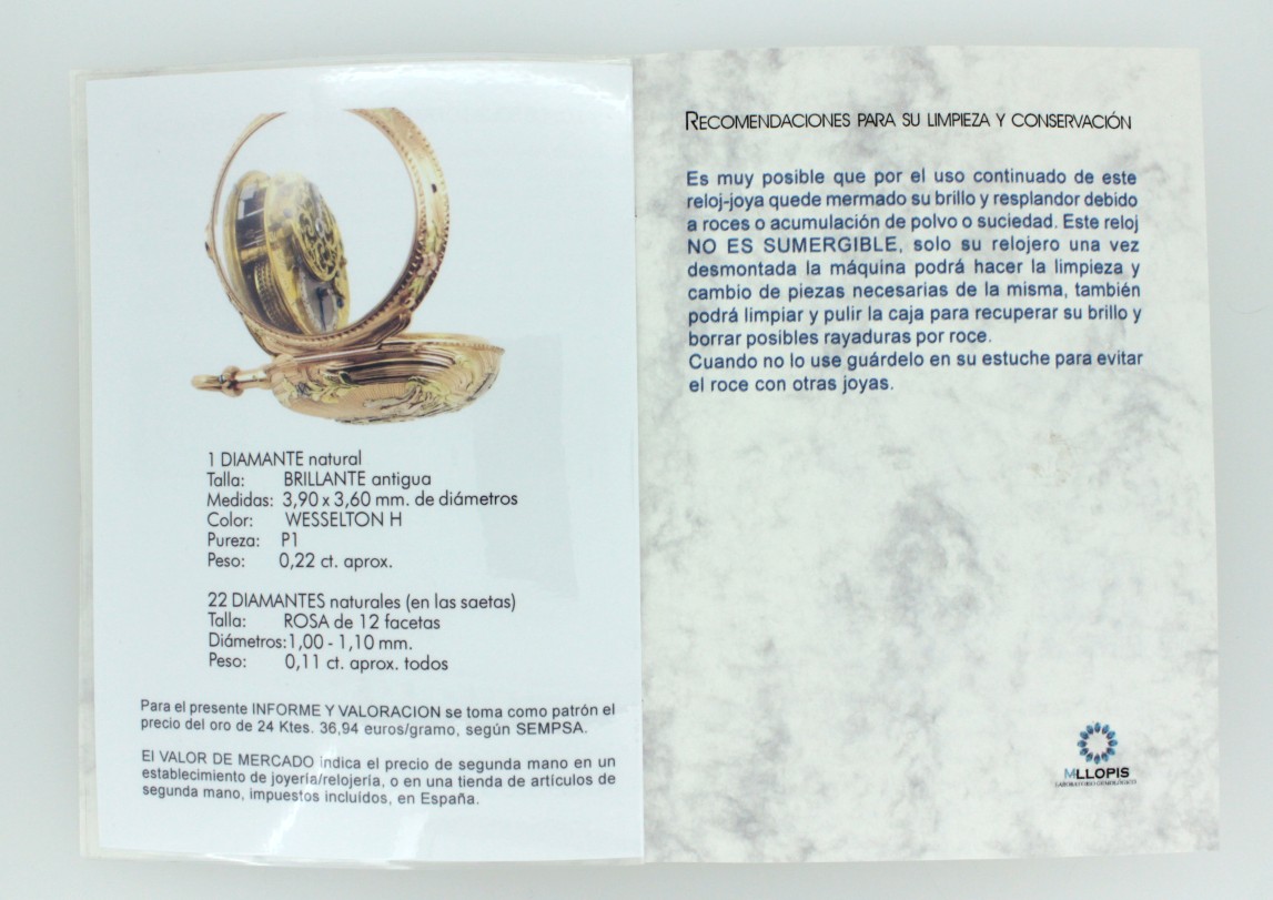 En MLLOPIS incorporamos a nuestros Servicios de Valoración de Joyas, las Valoraciones de Relojes de Bolsillo antiguos. Hemos realizado un nuevo diseño de informe en el que se incorporan todos los datos necesarios para que un coleccionista o un entendido pueda apreciar la pieza en cuestión. Se ilustran varias fotos de calidad en la que se pueden observar las distintas partes de la pieza.