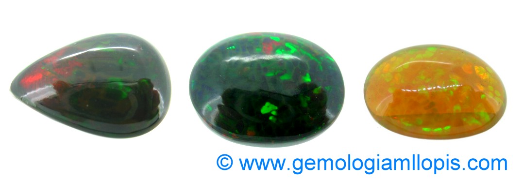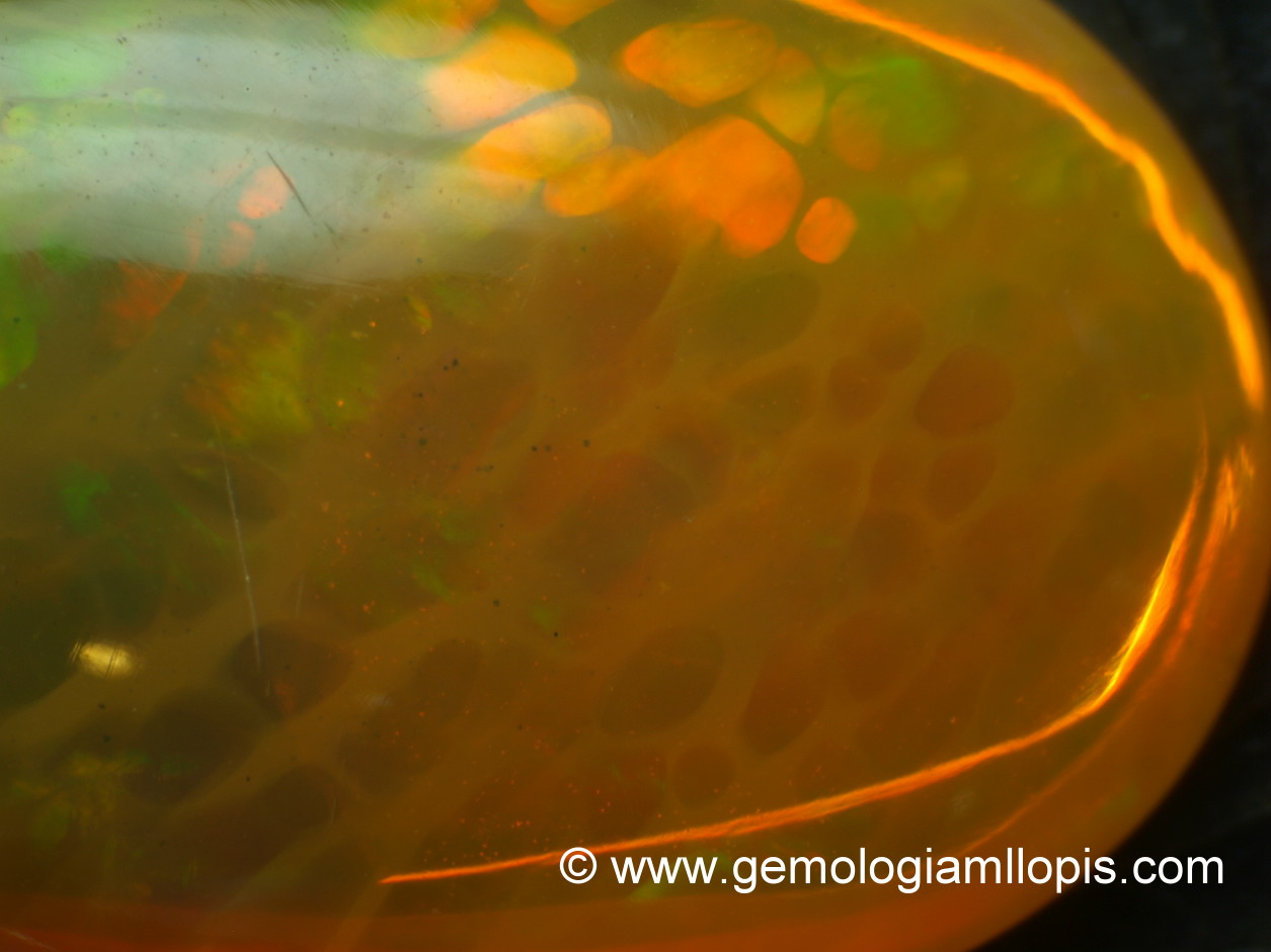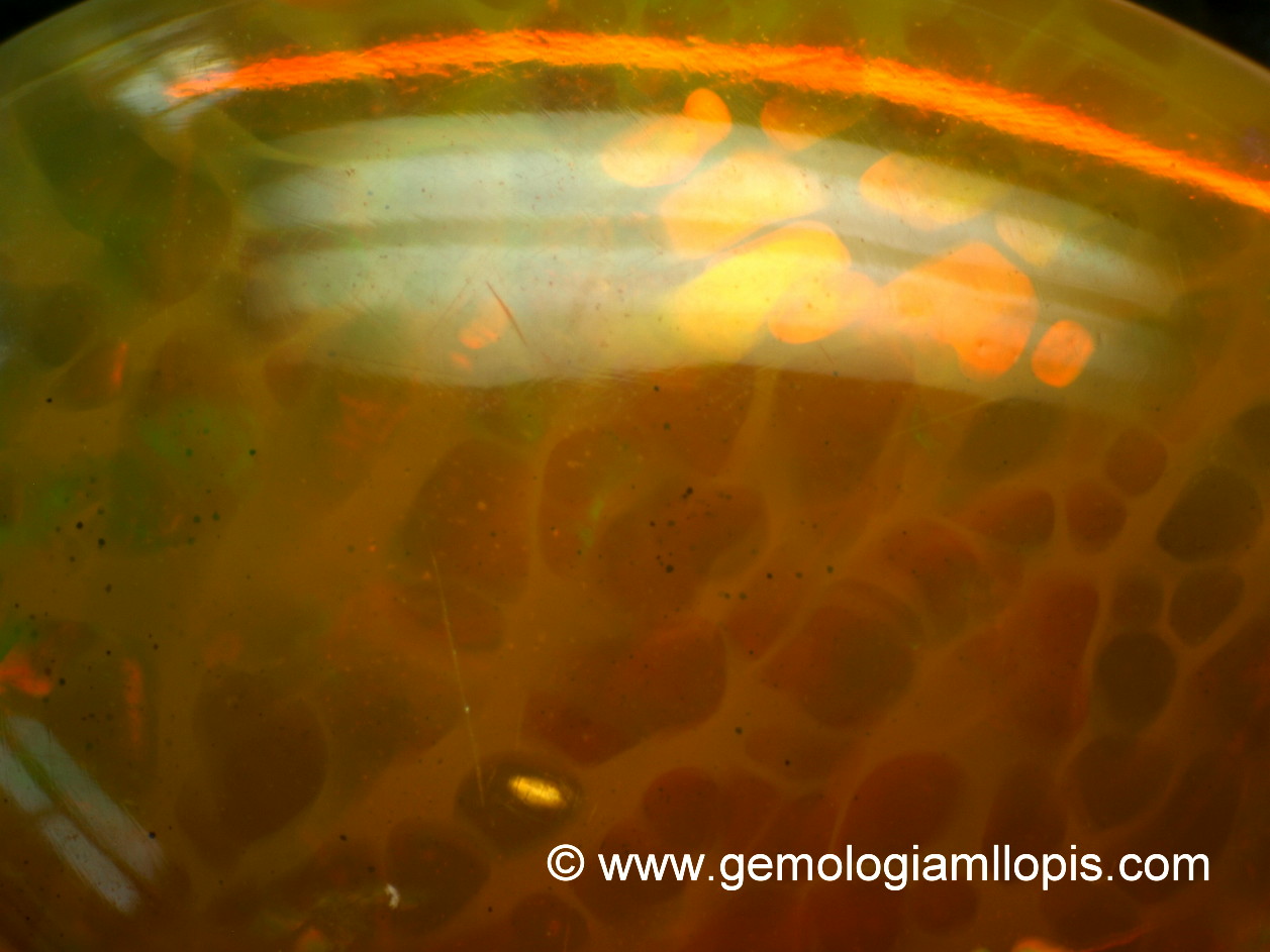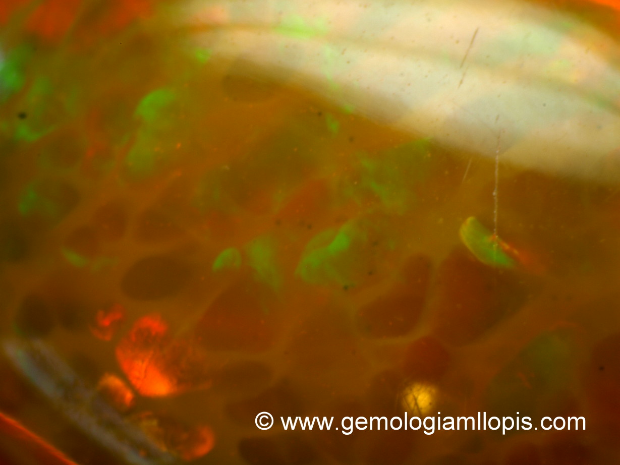 Observados los tres ejemplares con microscopio vemos en los de color negro estructura columnar que los naturales no presentan, y en el de color anaranjado manchas a capas como piel de lagarto. Presentan inclusiones diseminadas de puntos negros. Los ópalos de Welo también pueden presentar aspecto columnar y colores localizados pero los índices de refracción son superiores.
