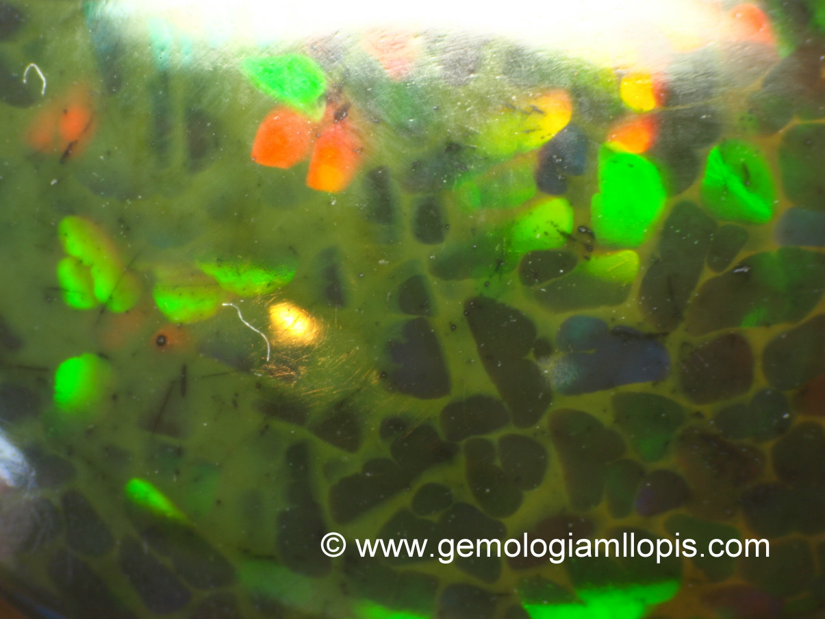 Ópalo sintético con juego de colores a manchas muy localizadas y claramente separadas. «Piel de lagarto»