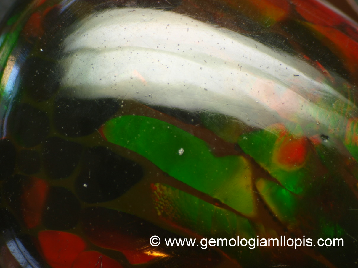 Òpalo sintético, aspecto de manchas o escamas muy localizadas y claramente separadas, «piel de lagarto».