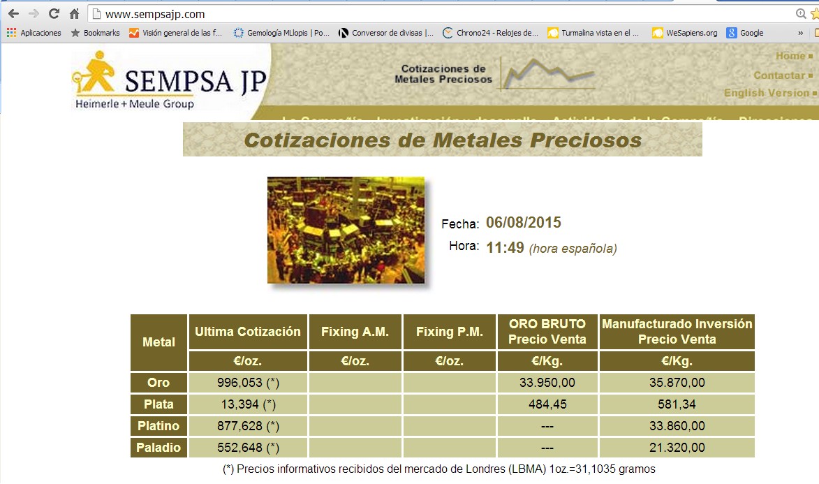 No se si es la primera vez, creo que no, pero de esta estoy seguro. Acabo de ver en la página de SEMPSA que el oro de 24 quilates está mas caro que el platino de 1000 milésimas. He fotografiado su web para que quede constancia. No se si es un hecho histórico, pero creo que si es relevante.
