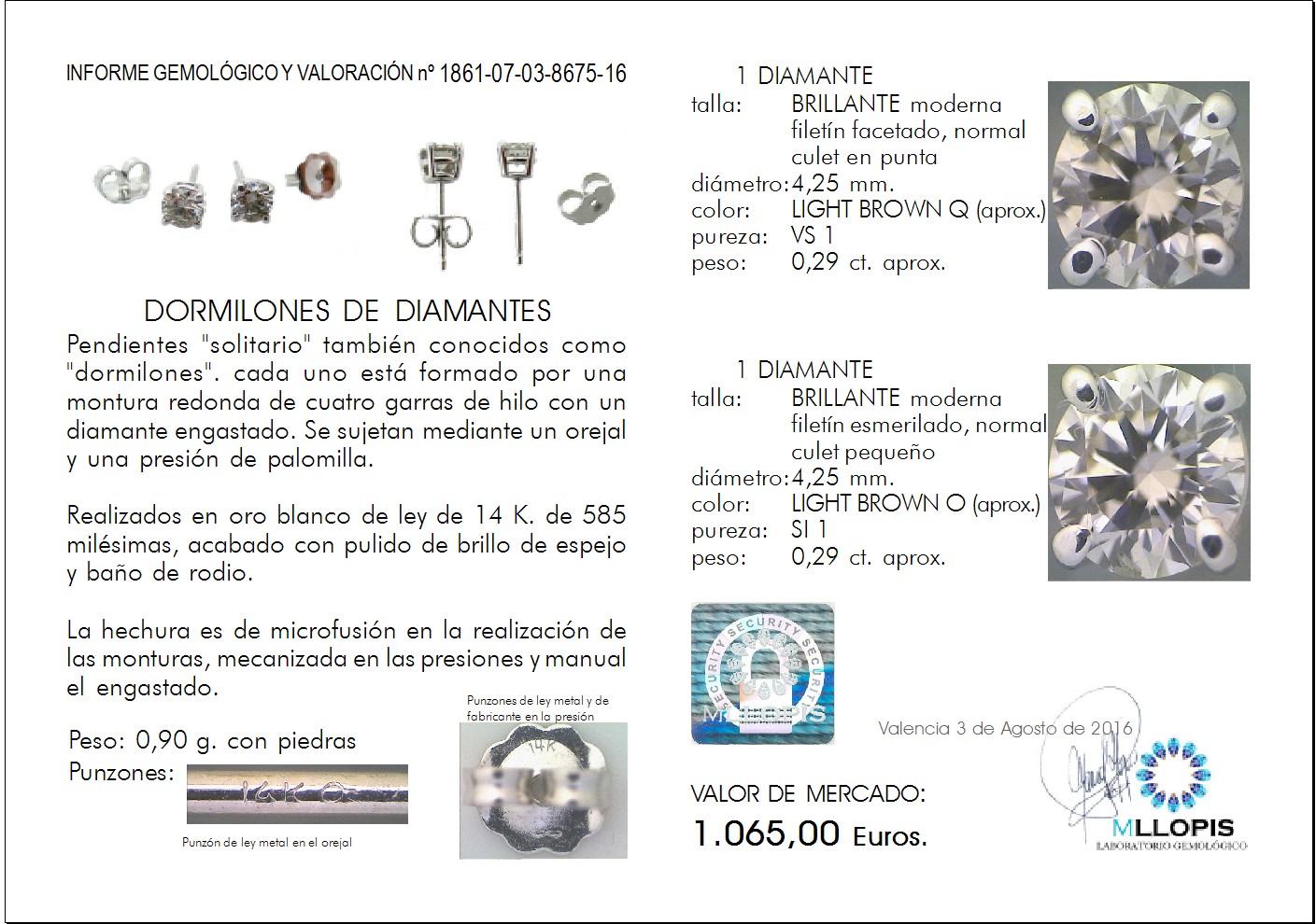 • La primera fue al medir el diámetro que en ambas piedras es de 4,25 mm. (medido con un calibrador Presidium), con ese diámetro y al no poder medir la altura de las piedras porque la montura no lo permite, como máximo la piedra puede pesar 0,29 ct. (en el informe pone 0,34 ct. cada una) y el diámetro que iondica en el documento es de 5,20 mm. lo cual no es cierto. Este dato además tiene una repercusión en el precio de las piedras, porque la tarifa de precios de diamantes en la franja de pesos de 0,23 a 0,29 ct. es de menor  cuantía que la siguiente franja de 0,30 a 0,39 ct.