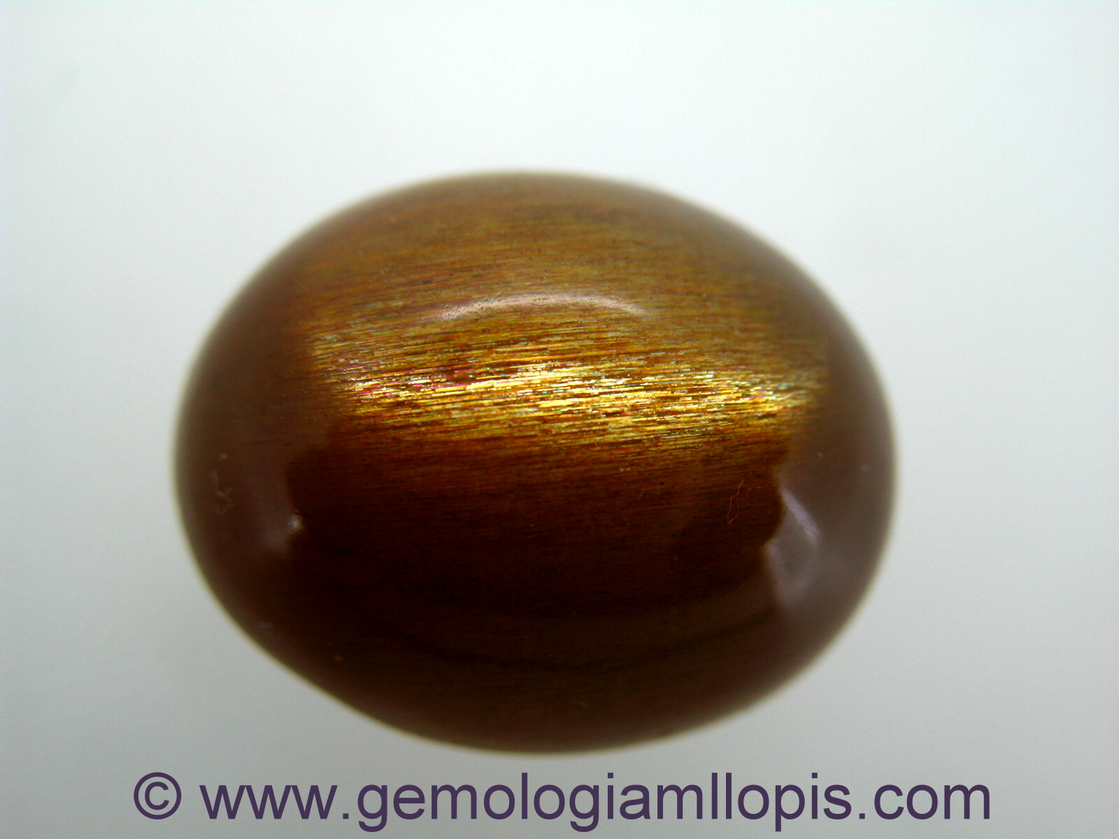 El feldespato oligoclasa, también llamado feldespato aventurina, produce unos ejemplares de color marrón dorado muy bonitos. En Gemología a este tipo de feldespato se le denomina piedra sol. Un ejemplar que llegó a nuestro laboratorio de 20,70 quilates, tallado en cabujón de 19,30 x 15,20 x 10,60 mm. El peso específico de 2,57 y el índice de refracción por visión distante es de 1,53.