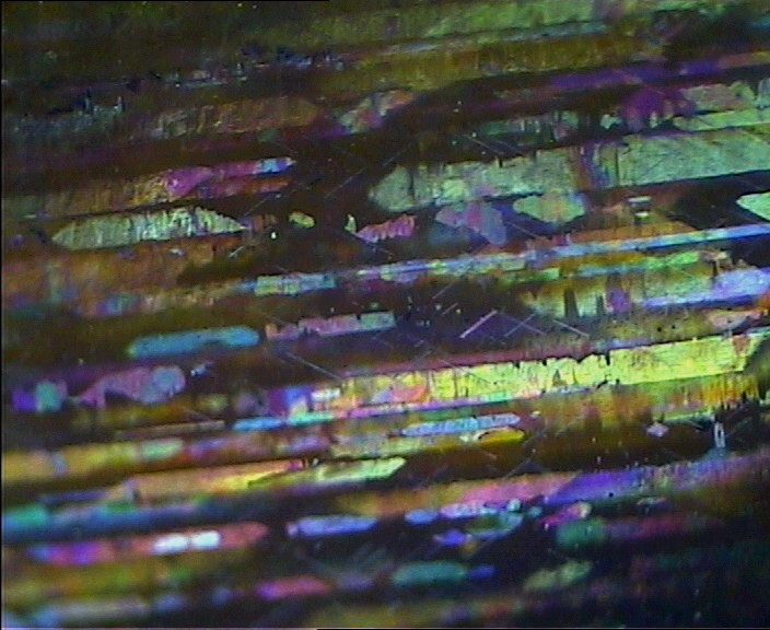 Inclusiones laminares de color rojo anaranjado fuerte. Probablemente hematite y agujas que se cruzan. Luz reflejada, 20X.