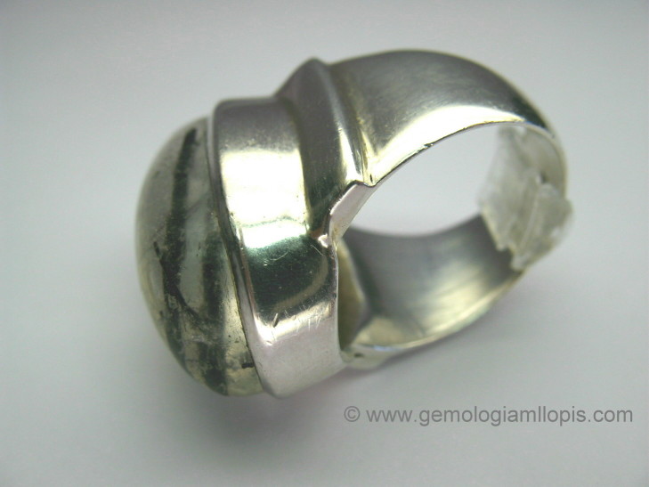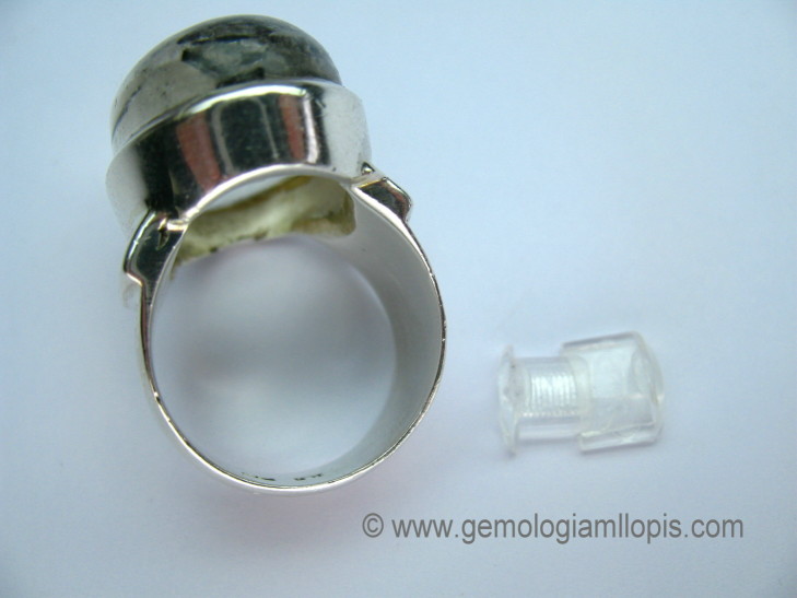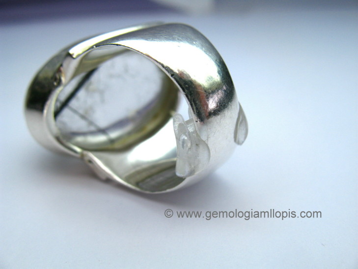 La señora me dejó verlo con mas detenimiento y me di cuenta de que era un pequeño aplique de plástico transparente que se acopla a varios anchos de brazo de sortija, crea un pequeño volumen en su interior e impide con esto que se gire, es como si redujera el diámetro de la sortija o en términos de joyero «acortar la sortija» reducirla de tamaño. Nos lo mostraba contándonos su eficacia, que le iba muy bien. Yo le conté que no lo había visto nunca, que en su defecto, lo que suelen hacer muchos joyeros es soldar en el interior del brazo una lámina de metal soldada por su centro y arqueados los extremos, de tal manera que son flexibles y se ciñen al dedo. También se les llama ceñidor.