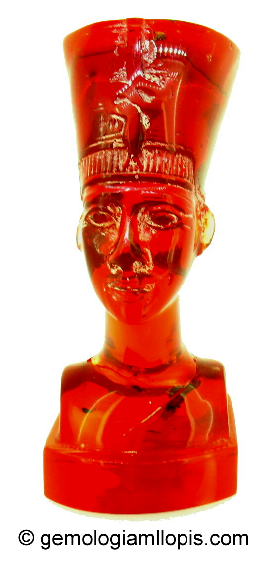 Vamos a describir un caso práctico en la identificación de estos materiales con una figura que nos trajeron al laboratorio. Se trataba de un busto de Nefertiti, la diosa de la antigüedad egipcia, y nuestro cliente quería saber si era de ámbar. Y, en efecto, la figura podía ser de ámbar, pero, también, podía ser una de las imitaciones que acabamos de apuntar. Así que nos pusimos en marcha…