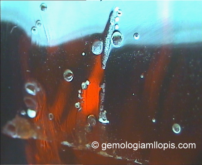 Utilizamos el microscopio gemológico para observar con detalle el interior del ejemplar y vimos que en la base tiene velos de color amarillo-naranja. Además, tiene varias hormigas comunes como inclusiones, burbujas esféricas, fisuras y materiales de aspecto terroso.