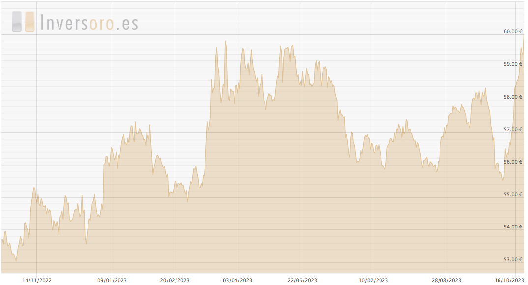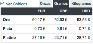 En el momento de hacer esta noticia el precio del oro de 24 K es de 60,17 €/g.