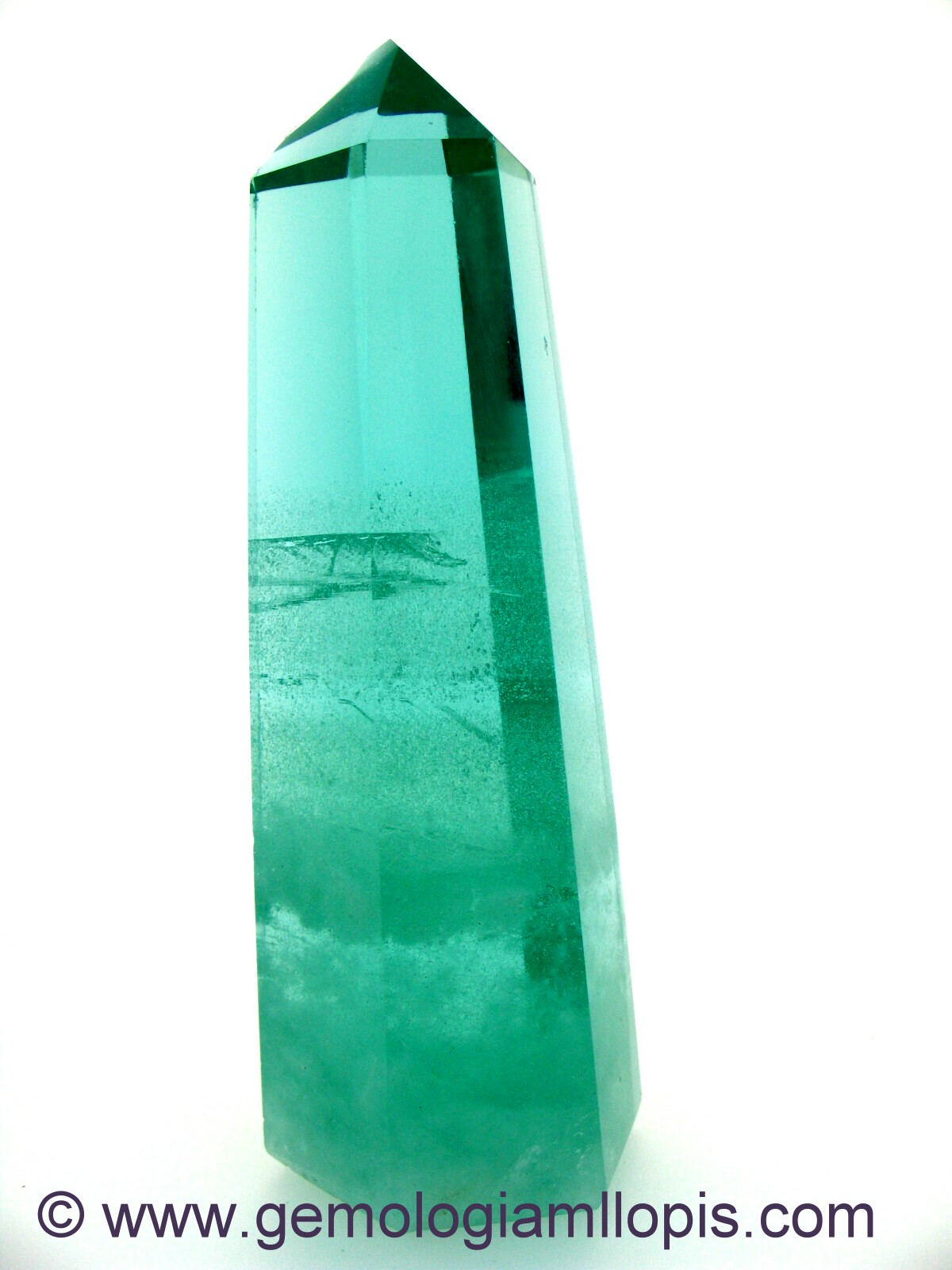 Hemos podido estudiar un bello ejemplar de moldavita de gran tamaño, nuestro cliente la tenía como objeto de decoración, pero no estaba seguro de lo que era. Está tallada en forma de gran prisma hexagonal, rematado con pirámide hexagonal y con la base plana para apoyarse verticalmente. De gran transparencia y con bello color azul claro verdoso, con lo típico que debemos encontrar en ella, sus burbujas, su aspecto jaraboso e inclusiones de mechones blancos, semejantes a bolas con agujas que solo se dan en especímenes raros.