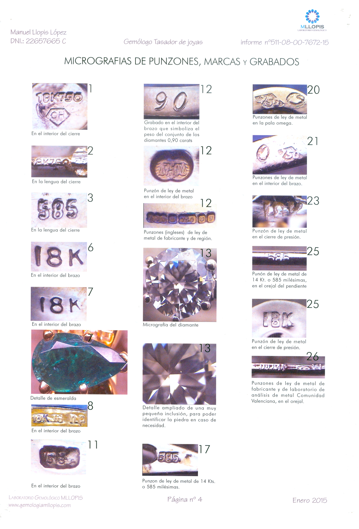 Hoja de Micrografías de punzones, marcas, gemas y grabados de una tasación MLLOPIS. Estos datos facilitan enormemente la recuperación de las joyas en caso de robo.