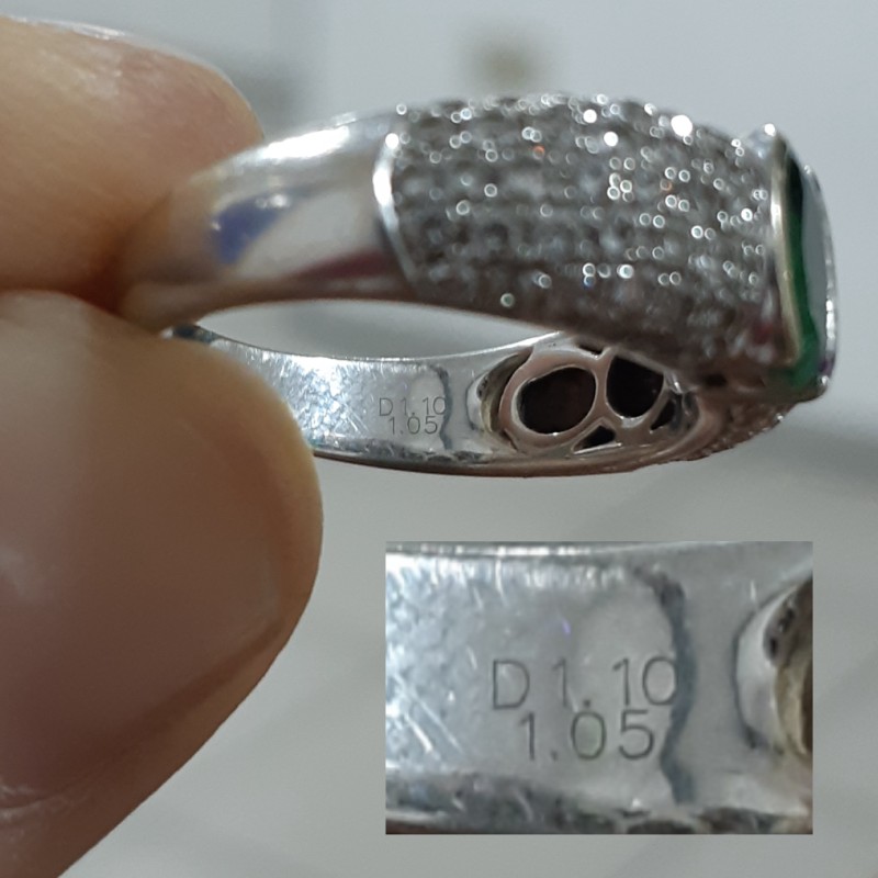 Vista de una parte del aro interior con la ampliación de lo grabado. Que indica D1,10 ct el peso de todos los diamantes y 1,05 ct. el peso de la esmeralda.