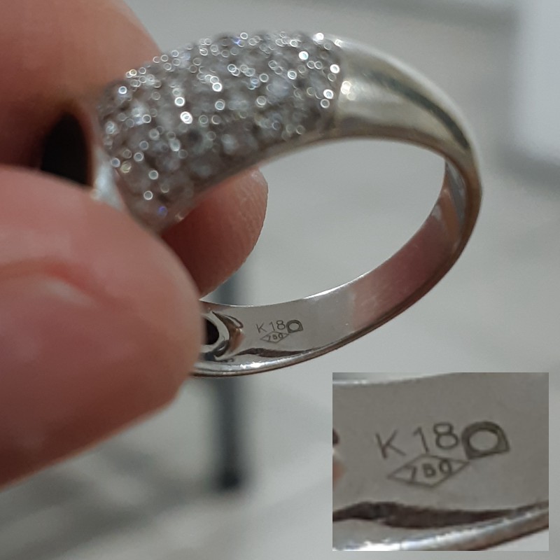 El símbolo K18 significa que su sortija está hecha de oro de ley de 18 quilates, o lo que es lo mismo 750 milésimas (símbolo en el rombo) . Oro puro es 24 K o 1000 milésimas, así que la aleación con paladio para hacer el oro blanco tienen una pureza del 75% de oro y un 25% de liga (generalmente paladio para el oro blanco).