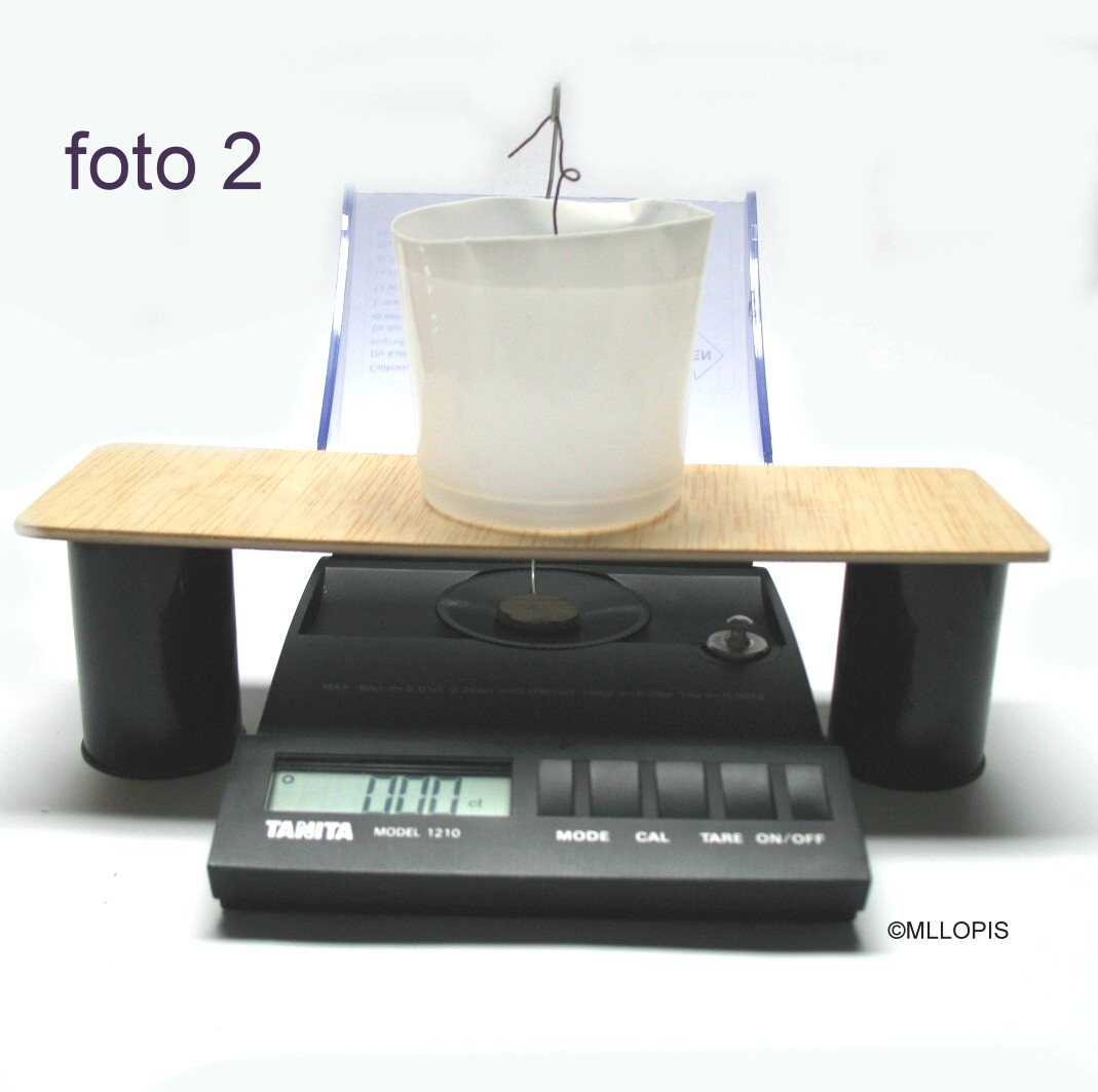 Foto 1 El alambre no debe rozar el vaso. Transmite el peso de la piedra hasta el platillo.