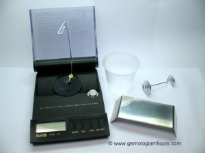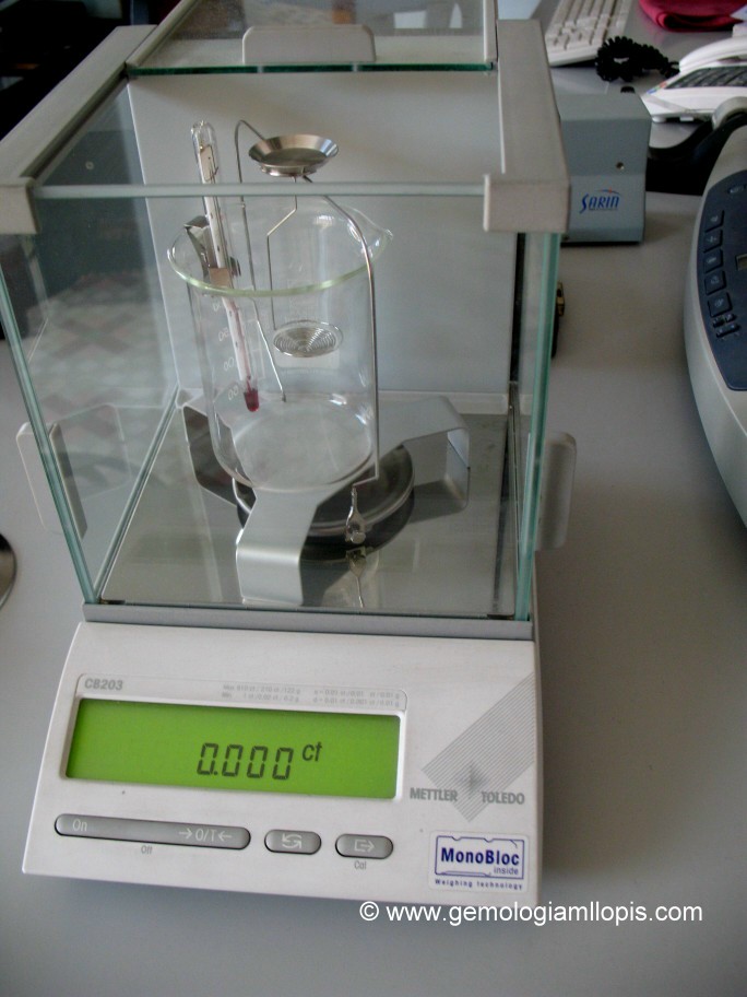 La balanza o quilatero portátil empleado para pesar exactamente una piedra también puede usarse para la determinación del peso específico, basta con colocar un puente sobre el platillo, tal como muestra la foto. El puente puede confeccionarse en casa con los materiales cotidianos (madera, tubos de carretes de fotos, alambre, vaso desechable, pastelina pegamento). Sobre el puente se coloca un vaso lleno hasta las tres cuartas partes con agua destilada. Se cuelga un hilo fino de acero inoxidable (o, en su defecto, de cobre o latón) y se enrosca el extremo inferior en forma de espiral para poder colocar la gema cuando esté sumergida en el agua; el otro extremo se sujeta en el brazo de la balanza torciendo simplemente el alambre en forma de anzuelo. Este anzuelo debe estar colocado a una distancia apropiada para que la espiral no llegue al fondo del vaso ni a las paredes. La balanza debe ahora tararse para asumir el peso del gancho y la espiral. La gema se pesa primero en el platillo como de costumbre, peso en el aire. Luego acoplamos el puente con el vaso y el hilo gancho con la espiral. Se coloca luego en la espiral y se determina su peso en el agua.