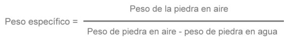 Hemos visto que el peso específico se calcula dividiendo el peso de la gema por el peso de un volumen igual de agua. Aunque es fácil pesar la piedra, es ya más difícil determinar el peso de un volumen equivalente de agua. Para ello nos basamos en el principio de que una sustancia sumergida en agua experimenta un empuje hacia arriba y pesa menos que si estuviera en el aire; la pérdida de peso es igual al peso del agua desplazada. Para determinar el peso específico, la piedra se pesa primero en el aire y luego en el agua. La diferencia entre las dos lecturas nos da el peso del volumen de agua equivalente; el peso específico se puede expresar entonces de la siguiente forma: