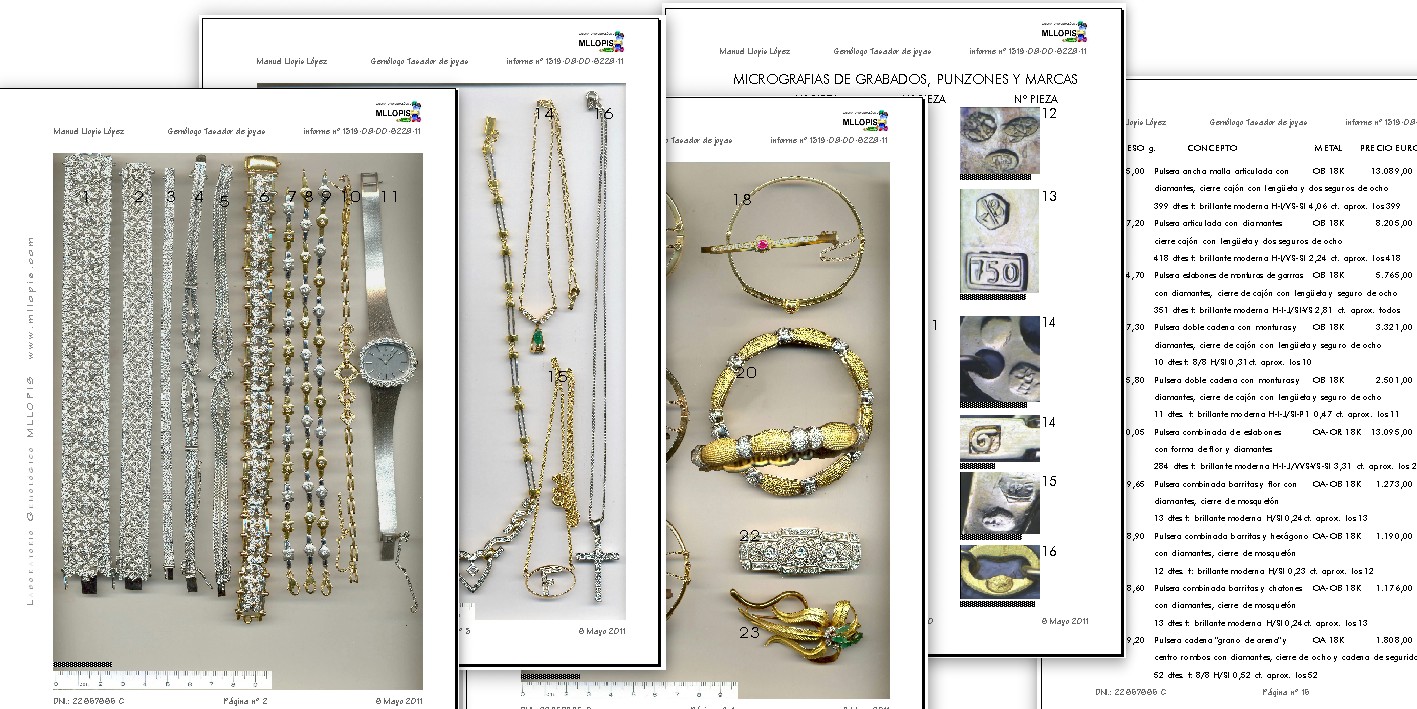 Valoración de joyas en formato listado. Fotos con las piezas numeradas, fotos de micrografías de punzones marcas y grabados y listado de valores.