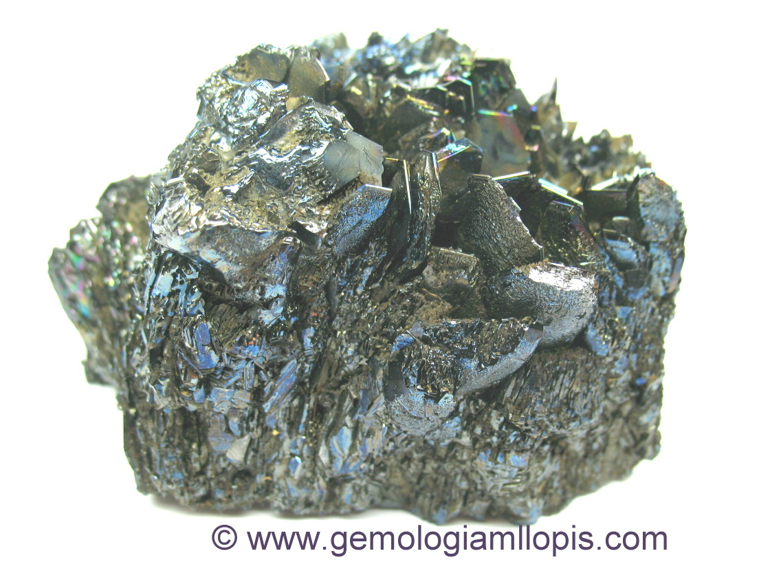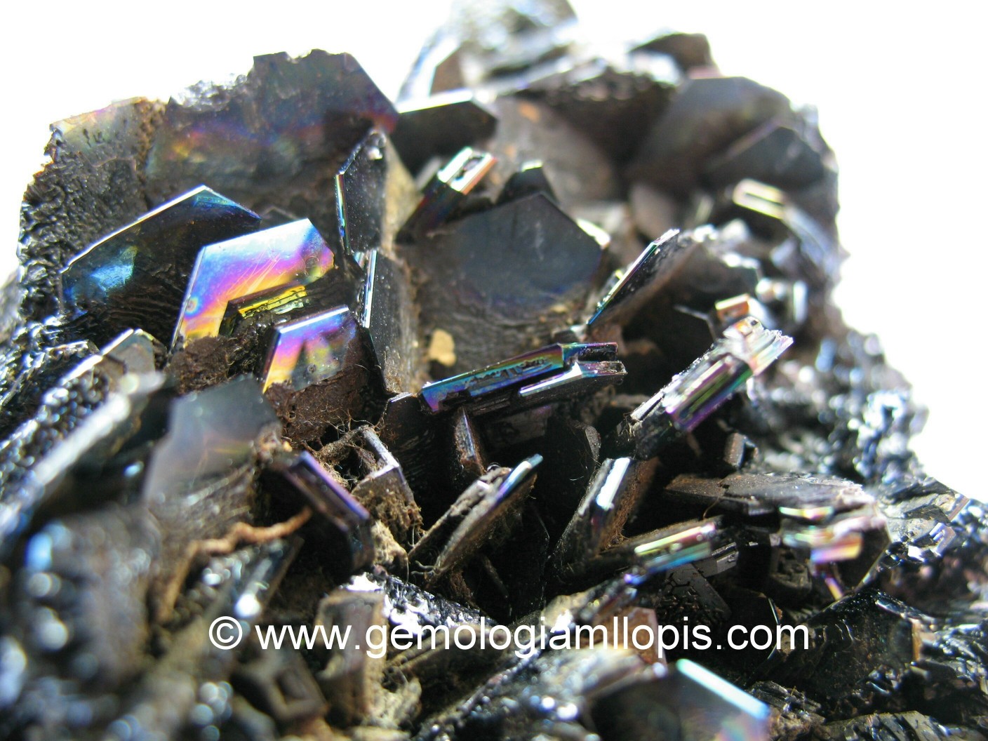 Hace unos días nos visitan unos clientes, que con aire de misterio querían que les valorara un fragmento de mineral que habían encontrado haciendo unas excavaciones en un solar de su propiedad. Un fragmento de unos 300 gramos en el que se aprecia un color negro, opaco, con cristales tabulares hexagonales de brillo casi metálico y zonas superficiales con iridiscencias. Teníamos claro que se trata de carborundum o carburo de silicio (SiC) que se se obtiene de arenas o cuarzo de alta pureza y coke de petróleo fusionados en horno eléctrico a más de 2000 ºC con la siguiente composición: SiO2 + 3 C SiC + 2 CO
