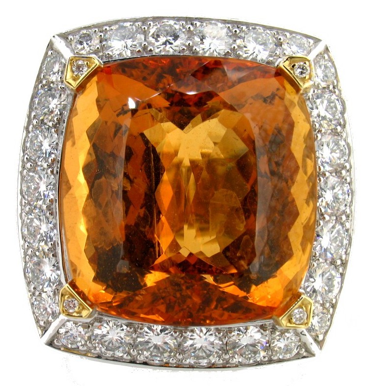 No es muy habitual encontrar topacios amarillo anaranjado de gran tamaño y excelente color y calidad. Por eso nos sorprendió cuando identificamos como topacio amarillo anaranjado una gema tallada en almohadón modificado cuyas medidas eran 22,75mm x 21,50mm x 13,40mm y pesaba 54,37 ct aproximadamente.