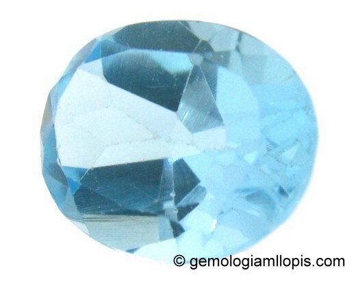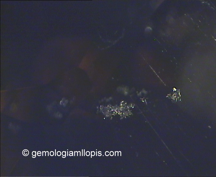 La identificación de este topacio no resultó difícil: los índices de refracción que pudimos apreciar con el refractómetro gemológico eran de 1,630 – 1,638 y la birrefringencia de 0,008. Bajo el microscopio pudimos ver que contenía inclusiones sólidas que, una vez consultado el Photoatlas de inclusiones en las gemas de E.J. Gübelin y J.I. Koivula, pensamos que podían ser cristales de fluorita, pero, aunque no podemos asegurar con certeza este punto, sí está claro que se tratan de inclusiones cristalinas. Además, la gema presentaba líneas rectas de crecimientos.