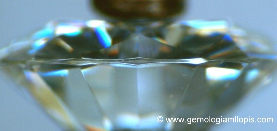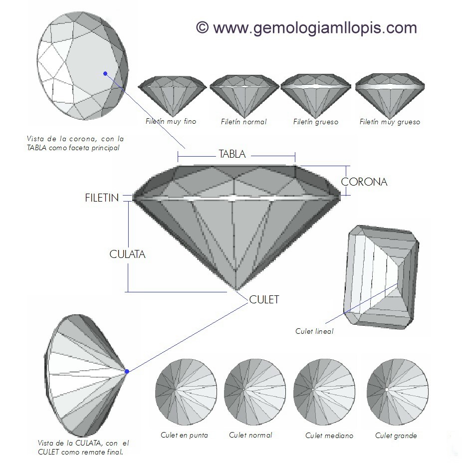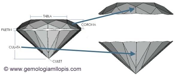 El «filetín» divide la piedra en dos partes bien diferenciadas. La parte de arriba, todo el conjunto de facetas se llama «corona» y la parte de abajo «culata». En la «corona», sea cual sea la talla, la faceta central mas grande, la que como gemólogos usamos para ver a través de ella sus inclusiones con una lupa 10x o un microscopio, la que cuando engastas una piedra en una joya es la que queda a la vista, y que puede tener diferente numero de lados, esa faceta se llama «tabla». En algunas tallas que veremos mas adelante, las facetas que rodean a la tabla, también tienen nombre. En la culata las facetas siempre convergen en un punto común o vértice llamado «culet». Suele ser un punto, pero muchas veces puede ser una faceta que se suele hacer para que las gemas no se astillen o fracturen fácilmente al ser tan puntiagudo. Dependiendo del tamaño de la faceta, el culet puede ser muy pequeño «en punta», pequeño, mediano o grande. Esto también es válido para el caso de piedras que por sus tallas con formas alargadas los culets son «lineales» y pueden estar facetados de la misma manera que los terminados en punta.