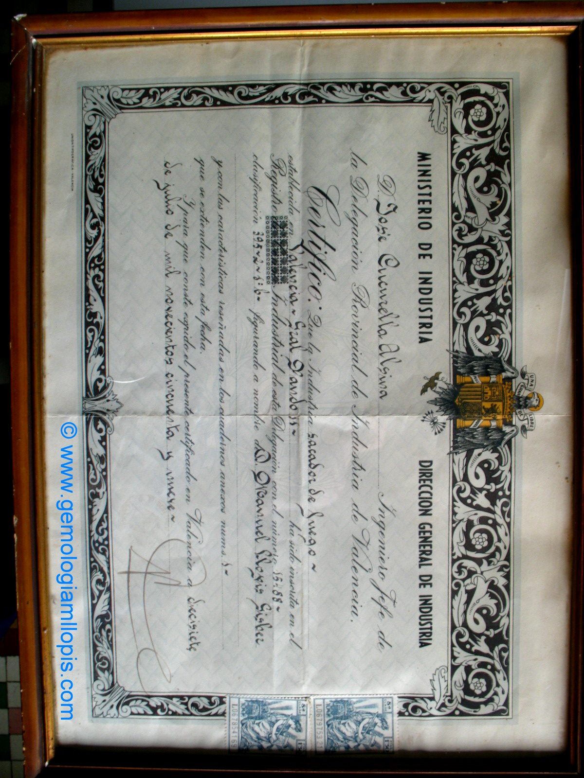 Entonces los títulos los emitía el Ministerio de Industria, y en este caso el certificado de este título lo firmaba Don José Cucurella Alsina, Ingeniero Jefe de la Delegación Provincial de Industria de Valencia.