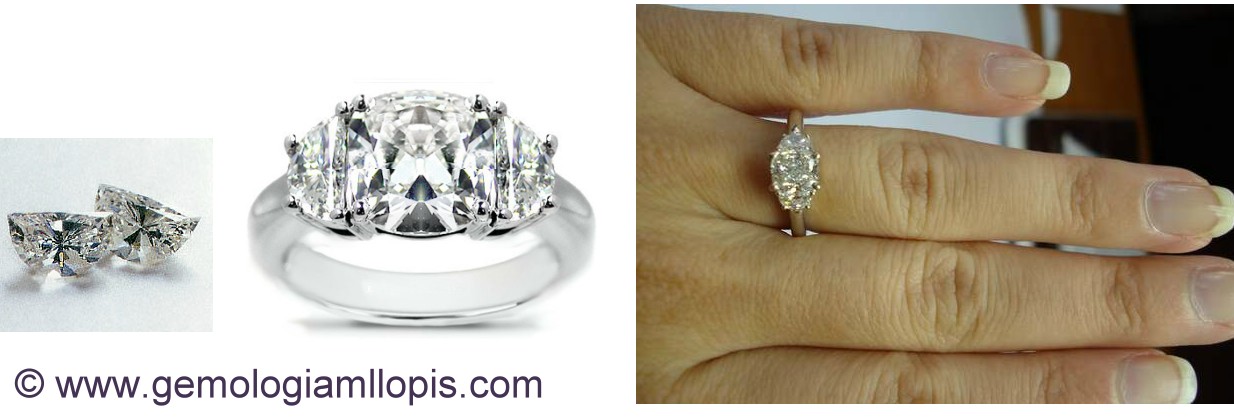 Esta talla se llama «amorillion cut» y juntas y engastadas con garras dan la apariencia de un diamante de talla marquis mas grande.