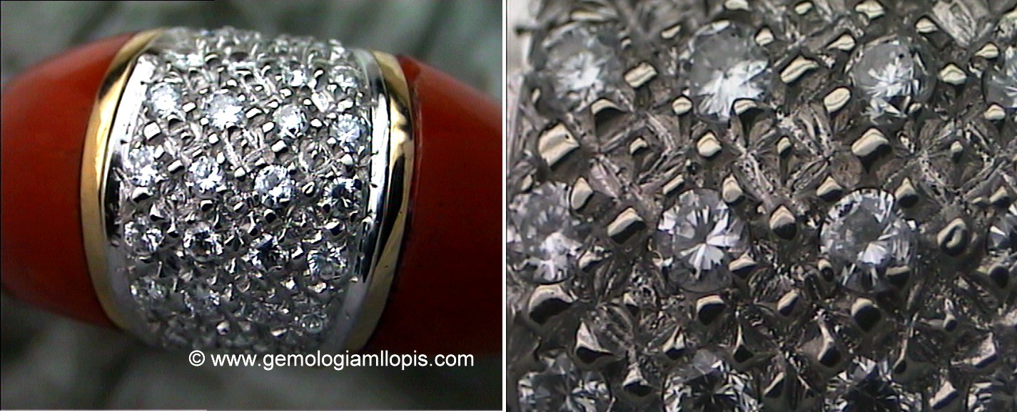 En este ejemplo de una sortija con brazo de coral y un pavé central de diamantes, podemos ver en la imagen de la derecha que está ampliada, que en realidad los diamantes no se tocan como en un pavé correcto, están muy separados y sustituidos por granos que con sus brillos dan la apariencia visual del pavé.