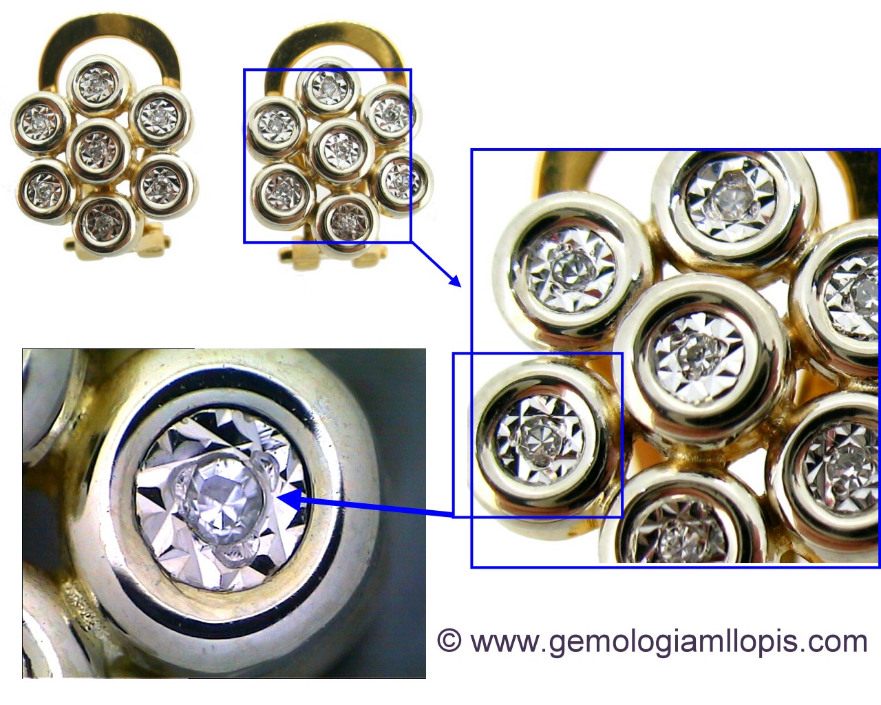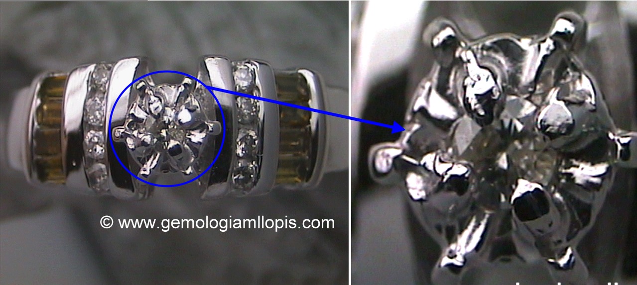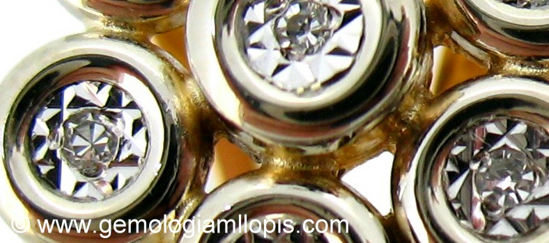 Otra forma es la de hacer un disco plano de oro blanco con cortes de guilloché que asemejen a las facetas de la talla brillante y en su centro colocar un pequeño diamante con dos granitos o pestañas, el conjunto se engasta como si todo él fuera la piedra. Se utiliza mucho en fotos de joyas para venta por catálogo. En las fotos es muy difícil apreciar el engaño. En realidad te dicen joyas con x quilates de diamantes y no te engañan en cuanto al peso, porque el público no sabe lo que ocupan de volumen esos quilates, pero sí te engañan en la apariencia, consiguen hacer ver lo que no es.