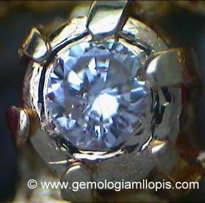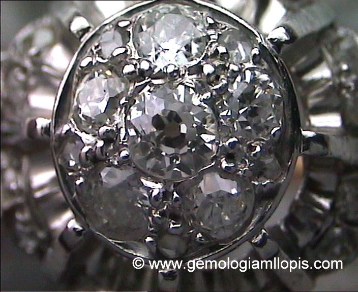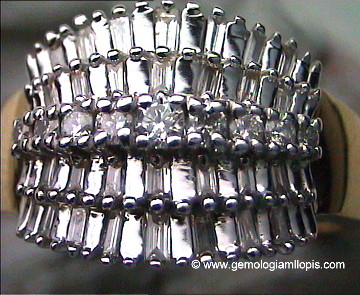 - Los que consiguen que veas una piedra donde no la hay. Como siempre la mas imitada es el diamante. Las que he podido apreciar porque han pasado por mis manos, suelen representar a la piedra con metal pulido, oro blanco mas comúnmente y ese brillo te hace ver una piedra donde no la hay. He podido apreciarlo en carriles de baguettes de diamantes en la que algunos de ellos son sustituidos por plaquitas lisas de metal del mismo tamaño y forma que los diamantes. He llegado a ver en algunos pavés, que la piedra no es piedra, el engastador ha sacado los granos y entre ellos ha dibujado el contorno de una piedra incluso con el buríl le ha dibujado facetas haciendo parecer que es un diamante. Otras veces es con una propia bolita redonda de oro blanco pulido y engastada como si fuera el diamante. En un conjunto donde hay muchas piedras engastadas, pasan desapercibidas las que no lo son.
